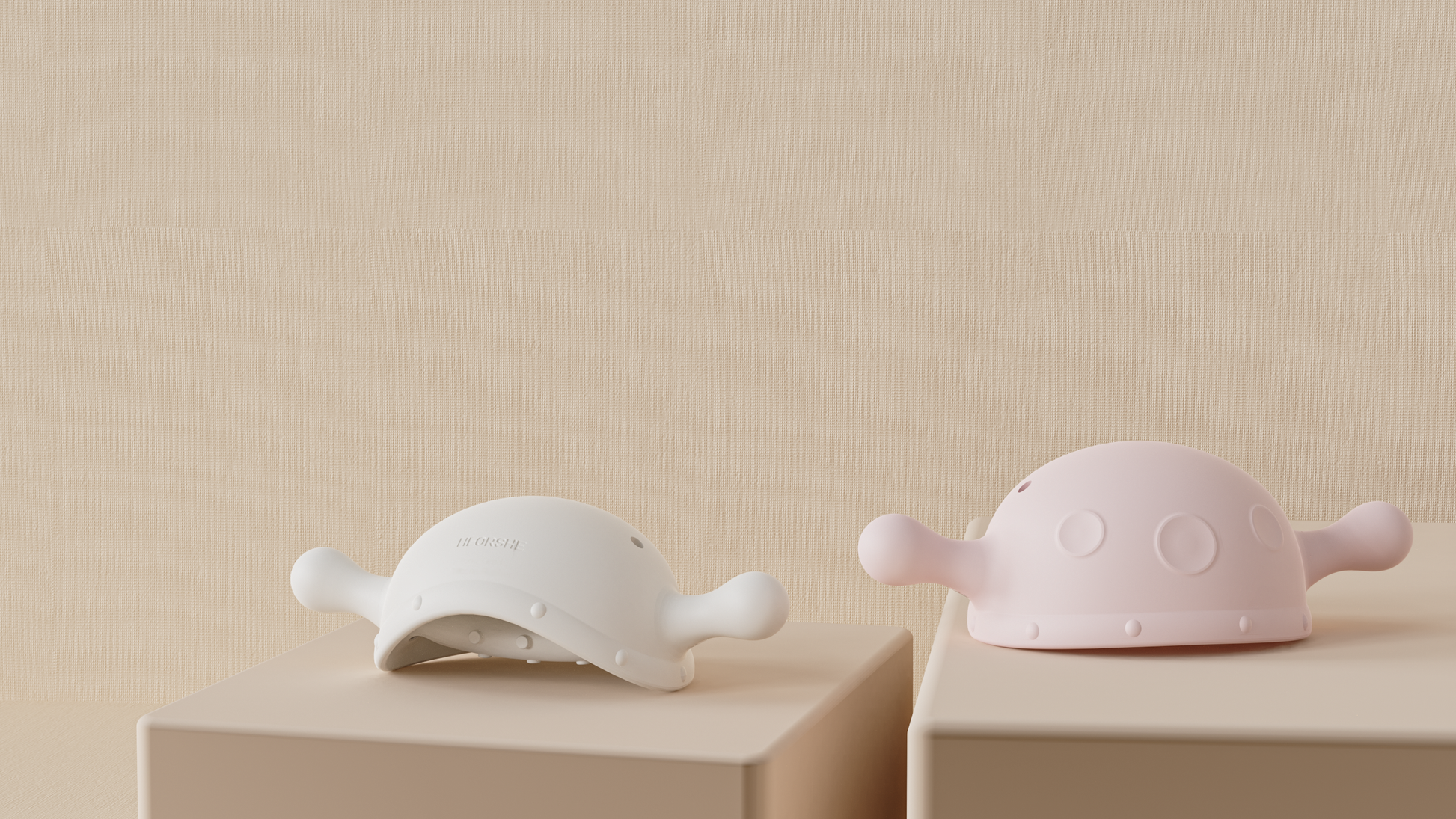 The HEORSHE Explorer Teether is thoughtfully shaped to sit comfortably in a baby’s hand. Its gently domed body, rounded “ear” handles and soft internal teat are designed to invite natural mouthing, squeezing and chewing during the teething stage.