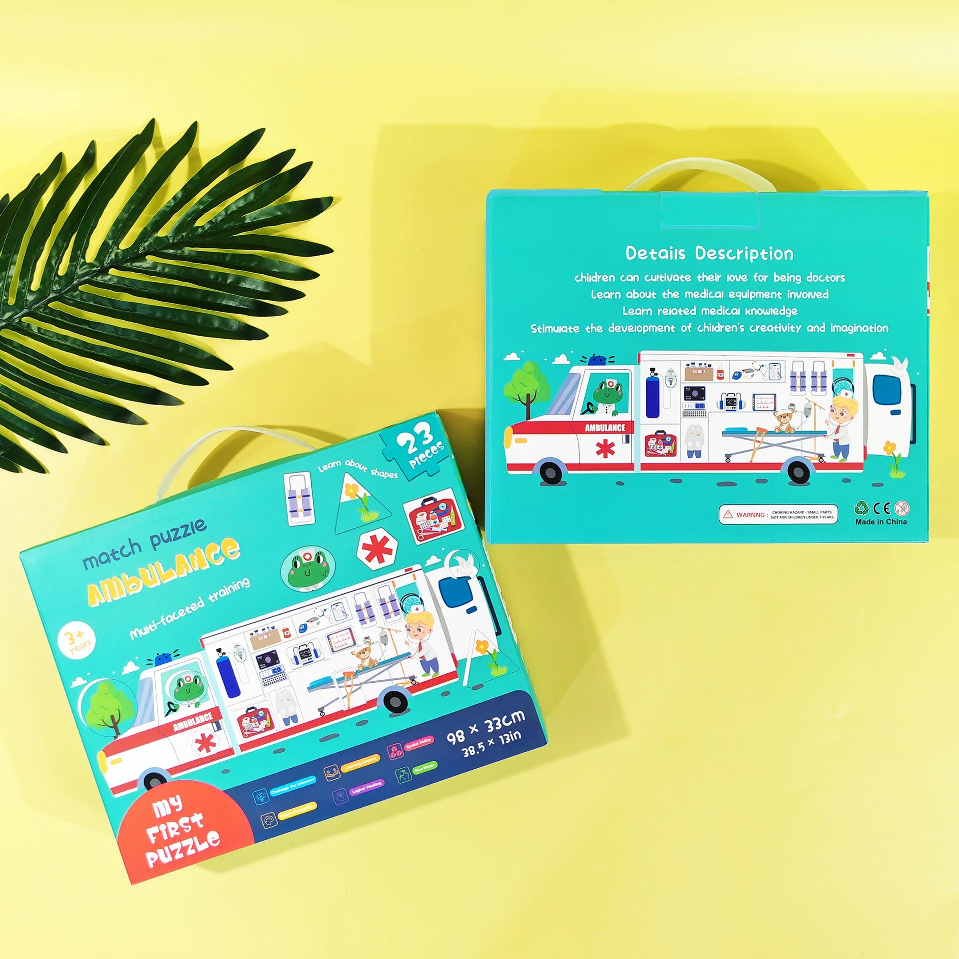 Each sturdy, oversized puzzle piece is easy to grasp and place, helping kids refine hand–eye coordination and spatial awareness. The finished design reveals a vibrant fire truck scene featuring firefighters, rescue equipment, and an ambulance — sparking conversations about teamwork, bravery, and helping others.